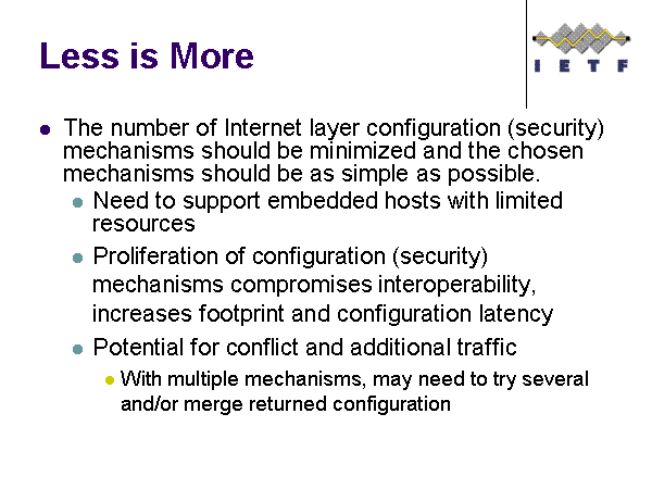 Less is More The number of Internet layer configuration (security) mechanisms should be minimized and the chosen mechanisms should be as simple as possible. Need to support embedded hosts with limited resources Proliferation of configuration (security) mechanisms compromises interoperability, increases footprint and configuration latency Potential for conflict and additional traffic With multiple mechanisms, may need to try several and/or merge returned configuration |