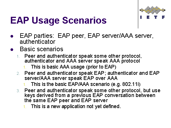EAP Usage Scenarios EAP parties: EAP peer, EAP server/AAA server, authenticator Basic scenarios Peer and authenticator speak some other protocol, authenticator and AAA server speak AAA protocol This is basic AAA usage (prior to EAP) Peer and authenticator speak EAP; authenticator and EAP server/AAA server speak EAP over AAA This is the basic EAP/AAA scenario (e.g. 802.11i) Peer and authenticator speak some other protocol, but use keys derived from a previous EAP conversation between the same EAP peer and EAP server This is a new application not yet defined. |