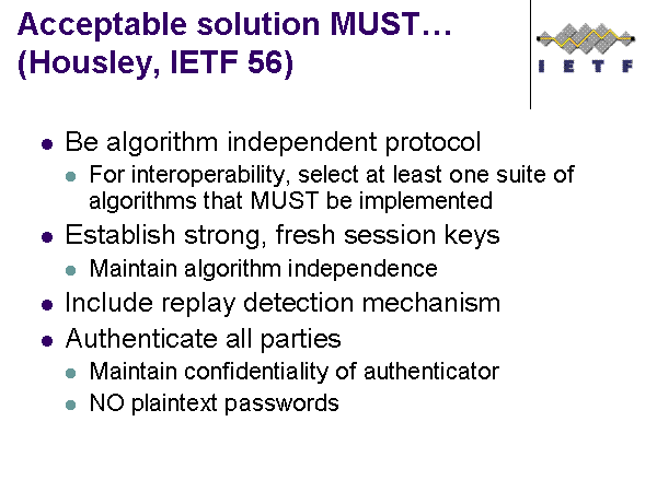 Acceptable solution MUST… (Housley, IETF 56)