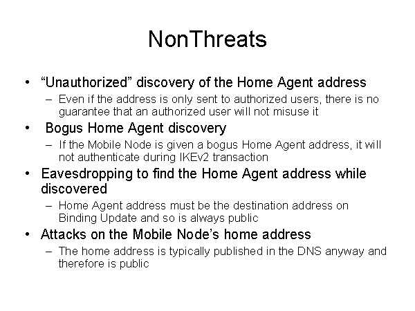 NonThreats “Unauthorized” discovery of the Home Agent address Even if the address is only sent to authorized users, there is no guarantee that an authorized user will not misuse it Bogus Home Agent discovery If the Mobile Node is given a bogus Home Agent address, it will not authenticate during IKEv2 transaction Eavesdropping to find the Home Agent address while discovered Home Agent address must be the destination address on Binding Update and so is always public Attacks on the Mobile Node’s home address The home address is typically published in the DNS anyway and therefore is public |