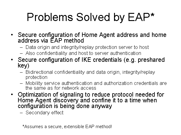 Problems Solved by EAP* Secure configuration of Home Agent address and home address via EAP method Data origin and integrity/replay protection server to host Also confidentiality and host to server authentication Secure configuration of IKE credentials (e.g. preshared key) Bidirectional confidentiality and data origin, integrity/replay protection Mobility service authentication and authorization credentials are the same as for network access Optimization of signaling to reduce protocol needed for Home Agent discovery and confine it to a time when configuration is being done anyway Secondary effect *Assumes a secure, extensible EAP method! |