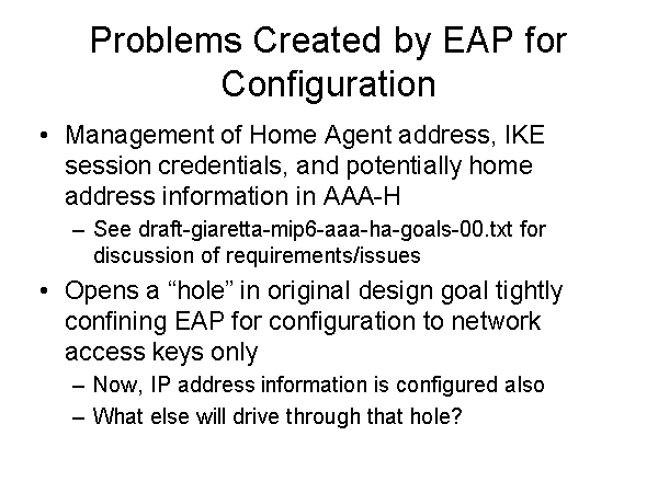 Problems Created by EAP for Configuration Management of Home Agent address, IKE session credentials, and potentially home address information in AAA-H See draft-giaretta-mip6-aaa-ha-goals-00.txt for discussion of requirements/issues Opens a “hole” in original design goal tightly confining EAP for configuration to network access keys only Now, IP address information is configured also What else will drive through that hole? |