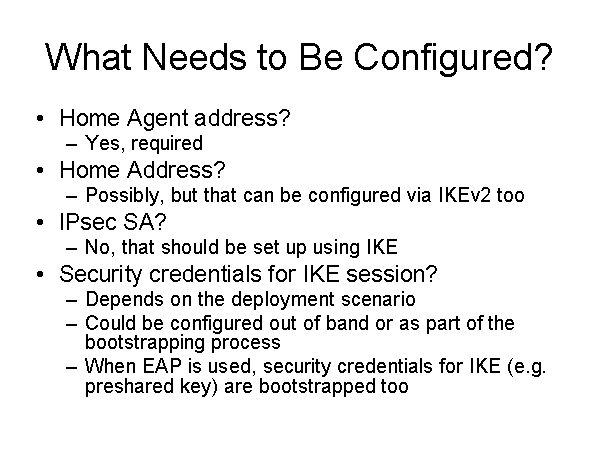 What Needs to Be Configured? Home Agent address? Yes, required Home Address? Possibly, but that can be configured via IKEv2 too IPsec SA? No, that should be set up using IKE Security credentials for IKE session? Depends on the deployment scenario Could be configured out of band or as part of the bootstrapping process When EAP is used, security credentials for IKE (e.g. preshared key) are bootstrapped too |