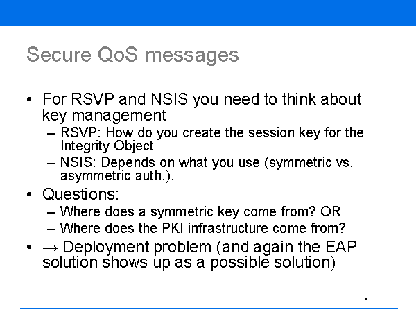Secure QoS messages For RSVP and NSIS you need to think about key management RSVP: How do you create the session key for the Integrity Object NSIS: Depends on what you use (symmetric vs. asymmetric auth.). Questions: Where does a symmetric key come from? OR Where does the PKI infrastructure come from? ? Deployment problem (and again the EAP solution shows up as a possible solution) |