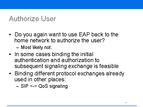 Authorize User Do you again want to use EAP back to the home network to authorize the user? Most likely not. In some cases binding the initial authentication and authorization to subsequent signaling exchange is feasible Binding different protocol exchanges already used in other places: SIP <-> QoS signaling |