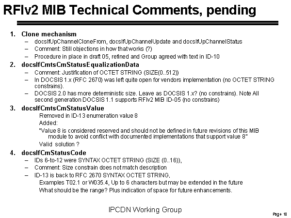 RFIv2 MIB Technical Comments, pending Clone mechanism docsIfUpChannelCloneFrom, docsIfUpChannelUpdate and docsIfUpChannelStatus Comment: Still objections in how that works (?) Procedure in place in draft 05, refined and Group agreed with text in ID-10 docsIfCmtsCmStatusEqualizationData Comment: Justification of OCTET STRING (SIZE(0..512)) In DOCSIS 1.x (RFC 2670) was left quite open for vendors implementation (no OCTET STRING constrains). DOCSIS 2.0 has more deterministic size. Leave as DOCSIS 1.x? (no constrains). Note All second generation DOCSIS 1.1 supports RFIv2 MIB ID-05 (no constrains) docsIfCmtsCmStatusValue Removed in ID-13 enumeration value 8 Added: “Value 8 is considered reserved and should not be defined in future revisions of this MIB module to avoid conflict with documented implementations that support value 8” Valid solution ? docsIfCmStatusCode IDs 6-to-12 were SYNTAX OCTET STRING (SIZE (0..16)), Comment: Size constrain does not match description ID-13 is back to RFC 2670 SYNTAX OCTET STRING, Examples T02.1 or W035.4, Up to 6 characters but may be extended in the future What should be the range? Plus indication of space for future enhancements. |