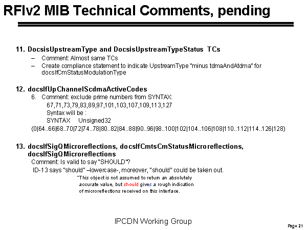 RFIv2 MIB Technical Comments, pending DocsisUpstreamType and DocsisUpstreamTypeStatus TCs Comment: Almost same TCs Create compliance statement to indicate UpstreamType “minus tdmaAndAtdma” for docsIfCmStatusModulationType docsIfUpChannelScdmaActiveCodes Comment: exclude prime numbers from SYNTAX: 67,71,73,79,83,89,97,101,103,107,109,113,127 Syntax will be : SYNTAX Unsigned32 (0|64..66|68..70|72|74..78|80..82|84..88|90..96|98..100|102|104..106|108|110..112|114..126|128) docsIfSigQMicroreflections, docsIfCmtsCmStatusMicroreflections, docsIfSigQMicroreflections Comment: Is valid to say “SHOULD”? ID-13 says “should” –lowercase-, moreover, “should” could be taken out. “This object is not assumed to return an absolutely accurate value, but should gives a rough indication of microreflections received on this interface. |