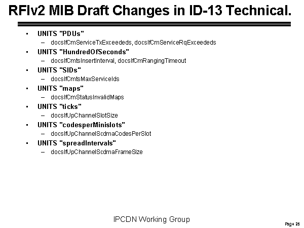 RFIv2 MIB Draft Changes in ID-13 Technical. UNITS "PDUs" docsIfCmServiceTxExceededs, docsIfCmServiceRqExceededs UNITS "HundredOfSeconds" docsIfCmtsInsertInterval, docsIfCmRangingTimeout UNITS "SIDs" docsIfCmtsMaxServiceIds UNITS "maps" docsIfCmStatusInvalidMaps UNITS "ticks" docsIfUpChannelSlotSize UNITS "codesperMinislots" docsIfUpChannelScdmaCodesPerSlot UNITS "spreadIntervals" docsIfUpChannelScdmaFrameSize |