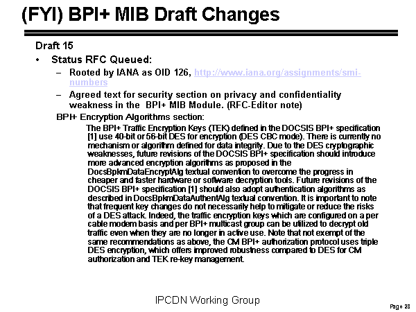 (FYI) BPI+ MIB Draft Changes Draft 15 Status RFC Queued: Rooted by IANA as OID 126, http://www.iana.org/assignments/smi-numbers Agreed text for security section on privacy and confidentiality weakness in the BPI+ MIB Module. (RFC-Editor note) BPI+ Encryption Algorithms section: The BPI+ Traffic Encryption Keys (TEK) defined in the DOCSIS BPI+ specification [1] use 40-bit or 56-bit DES for encryption (DES CBC mode). There is currently no mechanism or algorithm defined for data integrity. Due to the DES cryptographic weaknesses, future revisions of the DOCSIS BPI+ specification should introduce more advanced encryption algorithms as proposed in the DocsBpkmDataEncryptAlg textual convention to overcome the progress in cheaper and faster hardware or software decryption tools. Future revisions of the DOCSIS BPI+ specification [1] should also adopt authentication algorithms as described in DocsBpkmDataAuthentAlg textual convention. It is important to note that frequent key changes do not necessarily help to mitigate or reduce the risks of a DES attack. Indeed, the traffic encryption keys which are configured on a per cable modem basis and per BPI+ multicast group can be utilized to decrypt old traffic even when they are no longer in active use. Note that not exempt of the same recommendations as above, the CM BPI+ authorization protocol uses triple DES encryption, which offers improved robustness compared to DES for CM authorization and TEK re-key management. |