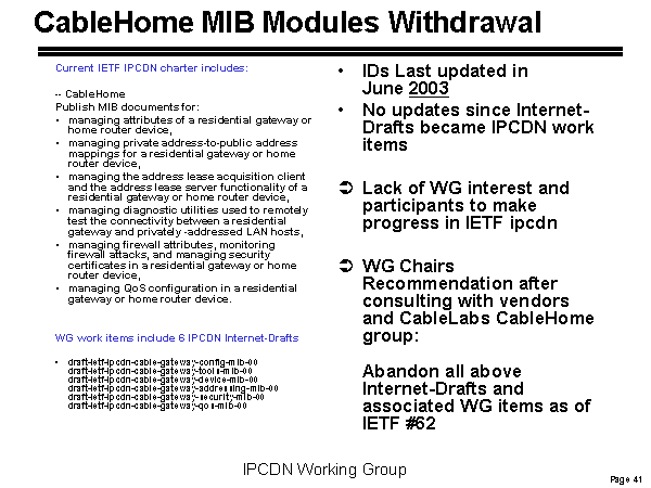 CableHome MIB Modules Withdrawal Current IETF IPCDN charter includes: -- CableHome Publish MIB documents for: managing attributes of a residential gateway or home router device, managing private address-to-public address mappings for a residential gateway or home router device, managing the address lease acquisition client and the address lease server functionality of a residential gateway or home router device, managing diagnostic utilities used to remotely test the connectivity between a residential gateway and privately -addressed LAN hosts, managing firewall attributes, monitoring firewall attacks, and managing security certificates in a residential gateway or home router device, managing QoS configuration in a residential gateway or home router device. WG work items include 6 IPCDN Internet-Drafts draft-ietf-ipcdn-cable-gateway-config-mib-00draft-ietf-ipcdn-cable-gateway-tools-mib-00draft-ietf-ipcdn-cable-gateway-device-mib-00draft-ietf-ipcdn-cable-gateway-addressing-mib-00draft-ietf-ipcdn-cable-gateway-security-mib-00draft-ietf-ipcdn-cable-gateway-qos-mib-00 IDs Last updated in June 2003 No updates since Internet-Drafts became IPCDN work items Lack of WG interest and participants to make progress in IETF ipcdn WG Chairs Recommendation after consulting with vendors and CableLabs CableHome group:Abandon all above Internet-Drafts and associated WG items as of IETF #62 |