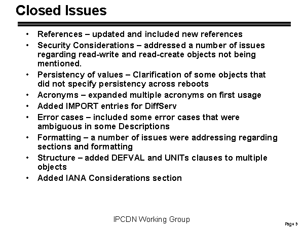 Closed Issues References – updated and included new references Security Considerations – addressed a number of issues regarding read-write and read-create objects not being mentioned. Persistency of values – Clarification of some objects that did not specify persistency across reboots Acronyms – expanded multiple acronyms on first usage Added IMPORT entries for DiffServ Error cases – included some error cases that were ambiguous in some Descriptions Formatting – a number of issues were addressing regarding sections and formatting Structure – added DEFVAL and UNITs clauses to multiple objects Added IANA Considerations section |