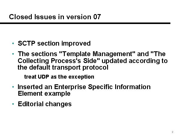 Closed Issues in version 07 SCTP section improved The sections "Template Management" and "The Collecting Process's Side" updated according to the default transport protocol treat UDP as the exception Inserted an Enterprise Specific Information Element example Editorial changes |