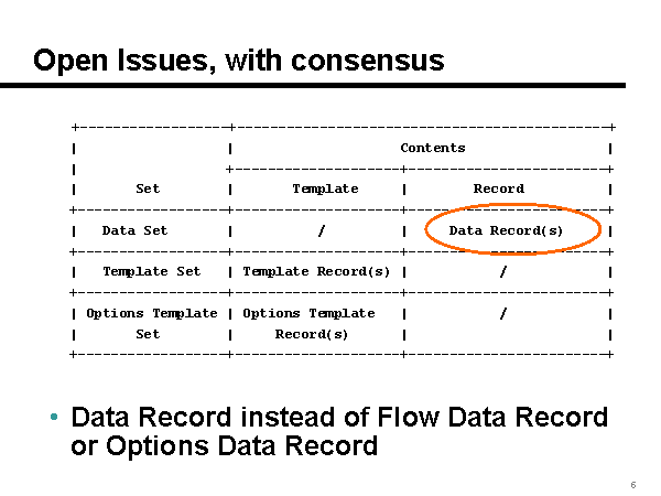 Open Issues, with consensus +------------------+---------------------------------------------+ | | Contents | | +--------------------+------------------------+ | Set | Template | Record | +------------------+--------------------+------------------------+ | Data Set | / | Data Record(s) | +------------------+--------------------+------------------------+ | Template Set | Template Record(s) | / | +------------------+--------------------+------------------------+ | Options Template | Options Template | / | | Set | Record(s) | | +------------------+--------------------+------------------------+ Data Record instead of Flow Data Record or Options Data Record |