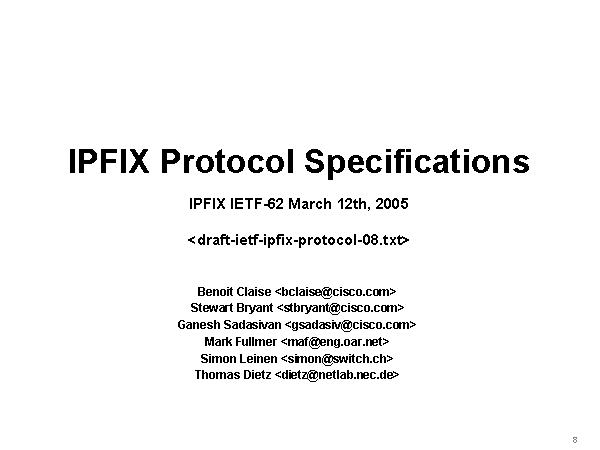 IPFIX Protocol SpecificationsIPFIX IETF-62 March 12th, 2005