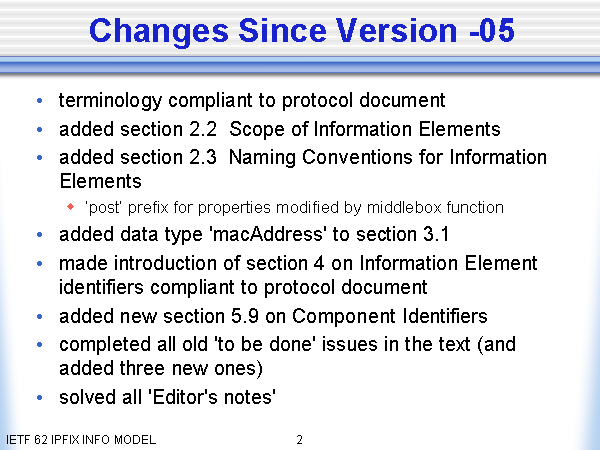 Changes Since Version -05 terminology compliant to protocol document added section 2.2 Scope of Information Elements added section 2.3 Naming Conventions for Information Elements ‘post‘ prefix for properties modified by middlebox function added data type 'macAddress' to section 3.1 made introduction of section 4 on Information Element identifiers compliant to protocol document added new section 5.9 on Component Identifiers completed all old 'to be done' issues in the text (and added three new ones) solved all 'Editor's notes' |
