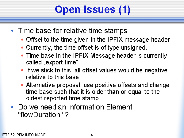 Open Issues (1) Time base for relative time stamps Offset to the time given in the IPFIX message header Currently, the time offset is of type unsigned. Time base in the IPFIX Message header is currently called „export time“ If we stick to this, all offset values would be negative relative to this base Alternative proposal: use positive offsets and change time base such that it is older than or equal to the oldest reported time stamp Do we need an Information Element "flowDuration" ? |