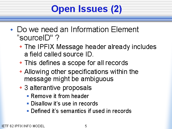Open Issues (2) Do we need an Information Element ”sourceID" ? The IPFIX Message header already includes a field called source ID. This defines a scope for all records Allowing other specifications within the message might be ambiguous 3 alterantive proposals Remove it from header Disallow it’s use in records Defined it’s semantics if used in records |