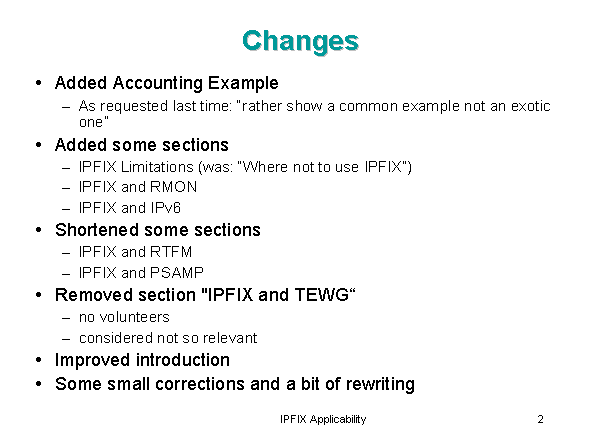Changes Added Accounting Example As requested last time: “rather show a common example not an exotic one” Added some sections IPFIX Limitations (was: “Where not to use IPFIX”) IPFIX and RMON IPFIX and IPv6 Shortened some sections IPFIX and RTFM IPFIX and PSAMP Removed section "IPFIX and TEWG“ no volunteers considered not so relevant Improved introduction Some small corrections and a bit of rewriting |