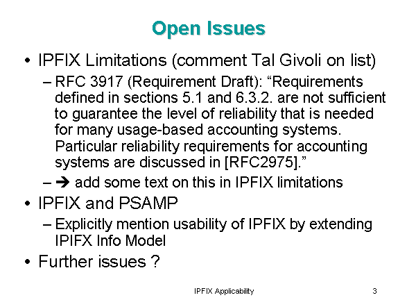 Open Issues IPFIX Limitations (comment Tal Givoli on list) RFC 3917 (Requirement Draft): “Requirements defined in sections 5.1 and 6.3.2. are not sufficient to guarantee the level of reliability that is needed for many usage-based accounting systems. Particular reliability requirements for accounting systems are discussed in [RFC2975].” ? add some text on this in IPFIX limitations IPFIX and PSAMP Explicitly mention usability of IPFIX by extending IPIFX Info Model Further issues ? |