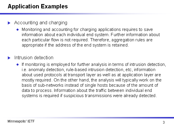 Application Examples Accounting and charging Monitoring and accounting for charging applications requires to save information about each individual end system. Further information about each particular flow is not required. Therefore, aggregation rules are appropriate if the address of the end system is retained. Intrusion detection If monitoring is employed for further analysis in terms of intrusion detection, i.e. anomaly detection, rule-based intrusion detection, etc, information about used protocols at transport layer as well as at application layer are mostly required. On the other hand, the analysis will typically work on the basis of sub-networks instead of single hosts because of the amount of data to process. Information about the traffic between individual end systems is required if suspicious transmissions were already detected. |