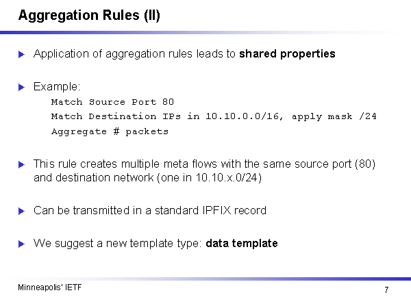 Aggregation Rules (II) Application of aggregation rules leads to shared properties Example: Match Source Port 80 Match Destination IPs in 10.10.0.0/16, apply mask /24 Aggregate # packets This rule creates multiple meta flows with the same source port (80) and destination network (one in 10.10.x.0/24) Can be transmitted in a standard IPFIX record We suggest a new template type: data template |