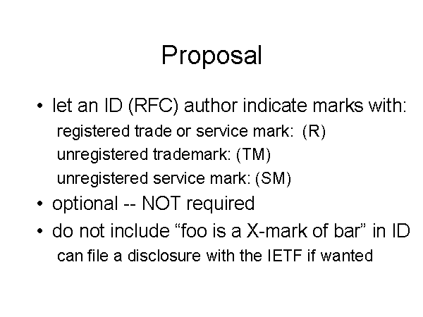Proposal let an ID (RFC) author indicate marks with: registered trade or service mark: (R) unregistered trademark: (TM) unregistered service mark: (SM) optional -- NOT required do not include “foo is a X-mark of bar” in ID can file a disclosure with the IETF if wanted |