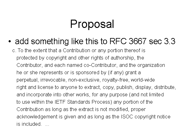Proposal add something like this to RFC 3667 sec 3.3 c. To the extent that a Contribution or any portion thereof is protected by copyright and other rights of authorship, the Contributor, and each named co-Contributor, and the organization he or she represents or is sponsored by (if any) grant a perpetual, irrevocable, non-exclusive, royalty-free, world-wide right and license to anyone to extract, copy, publish, display, distribute, and incorporate into other works, for any purpose (and not limited to use within the IETF Standards Process) any portion of the Contribution as long as the extract is not modified, proper acknowledgement is given and as long as the ISOC copyright notice is included. ... |