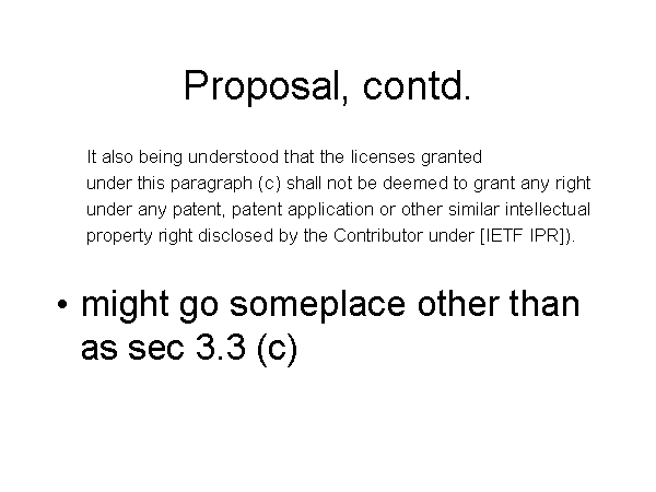 Proposal, contd. It also being understood that the licenses granted under this paragraph (c) shall not be deemed to grant any right under any patent, patent application or other similar intellectual property right disclosed by the Contributor under [IETF IPR]). might go someplace other than as sec 3.3 (c) |