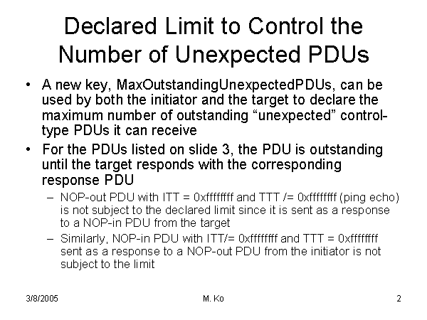 Declared Limit to Control the Number of Unexpected PDUs A new key, MaxOutstandingUnexpectedPDUs, can be used by both the initiator and the target to declare the maximum number of outstanding “unexpected” control-type PDUs it can receive For the PDUs listed on slide 3, the PDU is outstanding until the target responds with the corresponding response PDU NOP-out PDU with ITT = 0xffffffff and TTT /= 0xffffffff (ping echo) is not subject to the declared limit since it is sent as a response to a NOP-in PDU from the target Similarly, NOP-in PDU with ITT/= 0xffffffff and TTT = 0xffffffff sent as a response to a NOP-out PDU from the initiator is not subject to the limit |