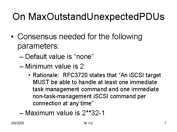 On MaxOutstandUnexpectedPDUs Consensus needed for the following parameters: Default value is “none” Minimum value is 2 Rationale: RFC3720 states that “An iSCSI target MUST be able to handle at least one immediate task management command and one immediate non-task-management iSCSI command per connection at any time” Maximum value is 2**32-1 |
