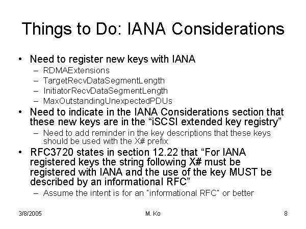 Things to Do: IANA Considerations Need to register new keys with IANA RDMAExtensions TargetRecvDataSegmentLength InitiatorRecvDataSegmentLength MaxOutstandingUnexpectedPDUs Need to indicate in the IANA Considerations section that these new keys are in the “iSCSI extended key registry” Need to add reminder in the key descriptions that these keys should be used with the X# prefix RFC3720 states in section 12.22 that “For IANA registered keys the string following X# must be registered with IANA and the use of the key MUST be described by an informational RFC” Assume the intent is for an “informational RFC” or better |