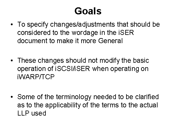 Goals To specify changes/adjustments that should be considered to the wordage in the iSER document to make it more General These changes should not modify the basic operation of iSCSI/iSER when operating on iWARP/TCP Some of the terminology needed to be clarified as to the applicability of the terms to the actual LLP used |