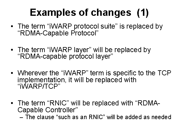 Examples of changes (1) The term “iWARP protocol suite” is replaced by “RDMA-Capable Protocol” The term “iWARP layer” will be replaced by “RDMA-capable protocol layer” Wherever the “iWARP” term is specific to the TCP implementation, it will be replaced with “iWARP/TCP” The term “RNIC” will be replaced with “RDMA-Capable Controller” The clause “such as an RNIC” will be added as needed |