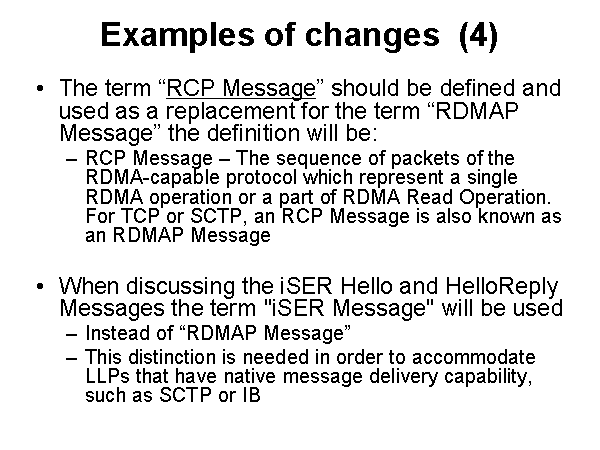Examples of changes (4) The term “RCP Message” should be defined and used as a replacement for the term “RDMAP Message” the definition will be: RCP Message – The sequence of packets of the RDMA-capable protocol which represent a single RDMA operation or a part of RDMA Read Operation. For TCP or SCTP, an RCP Message is also known as an RDMAP Message When discussing the iSER Hello and HelloReply Messages the term "iSER Message" will be used Instead of “RDMAP Message” This distinction is needed in order to accommodate LLPs that have native message delivery capability, such as SCTP or IB |