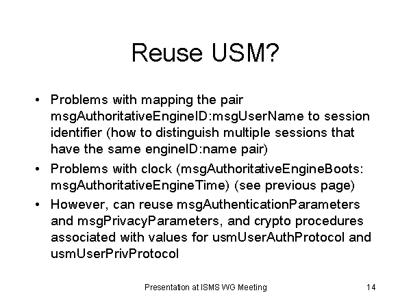 Reuse USM? Problems with mapping the pair msgAuthoritativeEngineID:msgUserName to session identifier (how to distinguish multiple sessions that have the same engineID:name pair) Problems with clock (msgAuthoritativeEngineBoots: msgAuthoritativeEngineTime) (see previous page) However, can reuse msgAuthenticationParameters and msgPrivacyParameters, and crypto procedures associated with values for usmUserAuthProtocol and usmUserPrivProtocol |