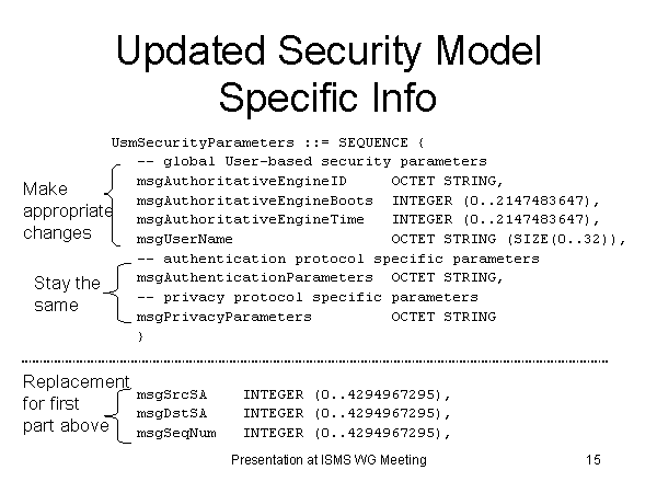 Updated Security Model Specific Info UsmSecurityParameters ::= SEQUENCE { -- global User-based security parameters msgAuthoritativeEngineID OCTET STRING, msgAuthoritativeEngineBoots INTEGER (0..2147483647), msgAuthoritativeEngineTime INTEGER (0..2147483647), msgUserName OCTET STRING (SIZE(0..32)), -- authentication protocol specific parameters msgAuthenticationParameters OCTET STRING, -- privacy protocol specific parameters msgPrivacyParameters OCTET STRING } msgSrcSA INTEGER (0..4294967295), msgDstSA INTEGER (0..4294967295), msgSeqNum INTEGER (0..4294967295), Stay the same Make appropriatechanges Replacement for firstpart above |