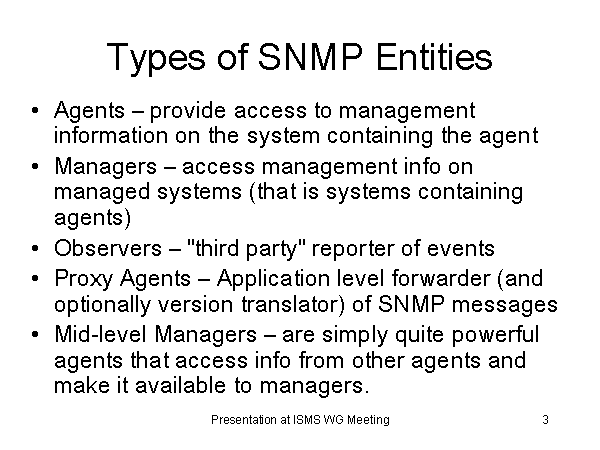 Types of SNMP Entities Agents – provide access to management information on the system containing the agent Managers – access management info on managed systems (that is systems containing agents) Observers – "third party" reporter of events Proxy Agents – Application level forwarder (and optionally version translator) of SNMP messages Mid-level Managers – are simply quite powerful agents that access info from other agents and make it available to managers. |