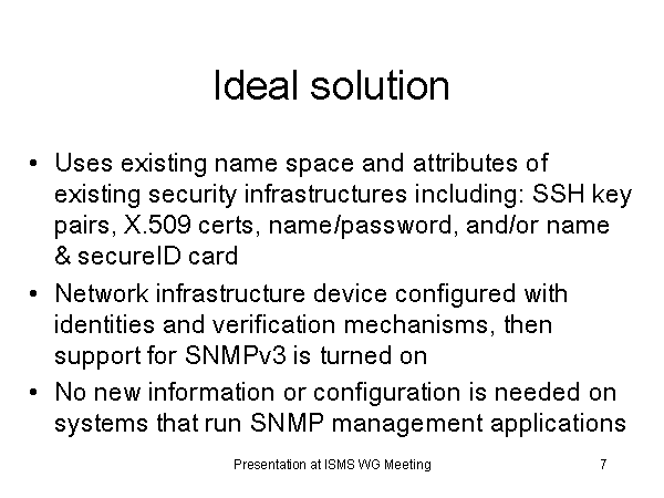Ideal solution Uses existing name space and attributes of existing security infrastructures including: SSH key pairs, X.509 certs, name/password, and/or name & secureID card Network infrastructure device configured with identities and verification mechanisms, then support for SNMPv3 is turned on No new information or configuration is needed on systems that run SNMP management applications |
