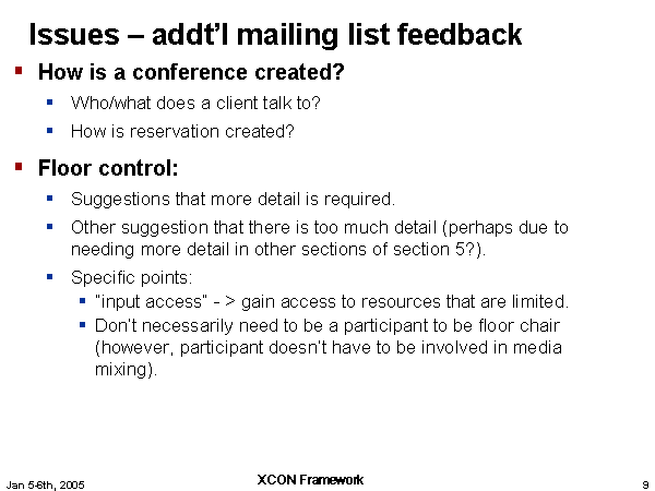 Issues – addt’l mailing list feedback How is a conference created? Who/what does a client talk to? How is reservation created? Floor control: Suggestions that more detail is required. Other suggestion that there is too much detail (perhaps due to needing more detail in other sections of section 5?). Specific points: “input access” - > gain access to resources that are limited. Don’t necessarily need to be a participant to be floor chair (however, participant doesn’t have to be involved in media mixing). |