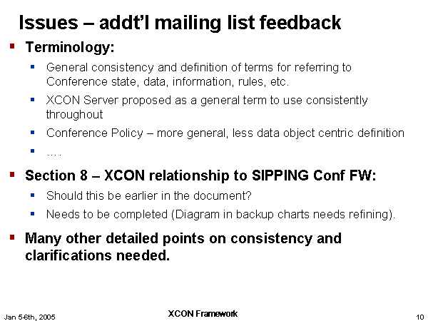 Issues – addt’l mailing list feedback Terminology: General consistency and definition of terms for referring to Conference state, data, information, rules, etc. XCON Server proposed as a general term to use consistently throughout Conference Policy – more general, less data object centric definition …. Section 8 – XCON relationship to SIPPING Conf FW: Should this be earlier in the document? Needs to be completed (Diagram in backup charts needs refining). Many other detailed points on consistency and clarifications needed. |