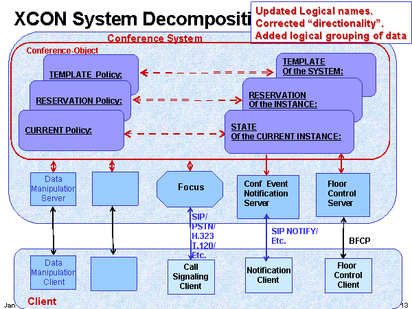 XCON System Decomposition Conference System Floor Control Client TEMPLATE Of the SYSTEM: Pre-configured Initial/Default values Conf Event Notification Server Focus Call Signaling Client TEMPLATE Policy: RESERVATION Policy: CURRENT Policy: RESERVATION Of the INSTANCE: STATE Of the CURRENT INSTANCE: Notification Client Floor Control Server SIP/ PSTN/ H.323 T.120/ Etc. SIP NOTIFY/ Etc. BFCP Client Updated Logical names. Corrected “directionality”. Added logical grouping of data Conference-Object Data Manipulation Server Data Manipulation Client |