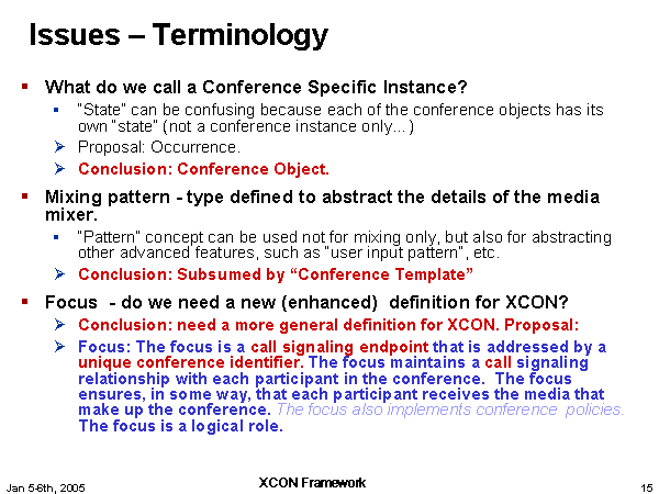 Issues – Terminology What do we call a Conference Specific Instance? “State” can be confusing because each of the conference objects has its own “state” (not a conference instance only…) Proposal: Occurrence. Conclusion: Conference Object. Mixing pattern - type defined to abstract the details of the media mixer. “Pattern” concept can be used not for mixing only, but also for abstracting other advanced features, such as “user input pattern”, etc. Conclusion: Subsumed by “Conference Template” Focus - do we need a new (enhanced) definition for XCON? Conclusion: need a more general definition for XCON. Proposal: Focus: The focus is a call signaling endpoint that is addressed by a unique conference identifier. The focus maintains a call signaling relationship with each participant in the conference. The focus ensures, in some way, that each participant receives the media that make up the conference. The focus also implements conference policies. The focus is a logical role. |