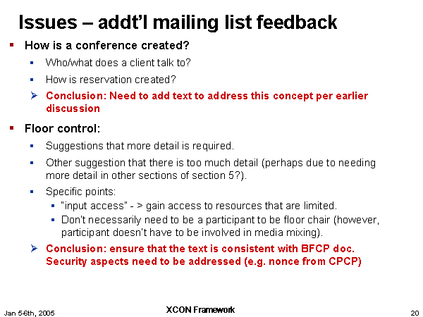 Issues – addt’l mailing list feedback How is a conference created? Who/what does a client talk to? How is reservation created? Conclusion: Need to add text to address this concept per earlier discussion Floor control: Suggestions that more detail is required. Other suggestion that there is too much detail (perhaps due to needing more detail in other sections of section 5?). Specific points: “input access” - > gain access to resources that are limited. Don’t necessarily need to be a participant to be floor chair (however, participant doesn’t have to be involved in media mixing). Conclusion: ensure that the text is consistent with BFCP doc. Security aspects need to be addressed (e.g. nonce from CPCP) |