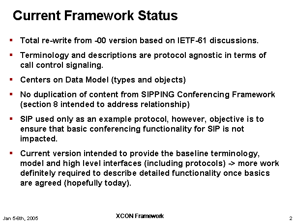 Current Framework Status Total re-write from -00 version based on IETF-61 discussions. Terminology and descriptions are protocol agnostic in terms of call control signaling. Centers on Data Model (types and objects) No duplication of content from SIPPING Conferencing Framework (section 8 intended to address relationship) SIP used only as an example protocol, however, objective is to ensure that basic conferencing functionality for SIP is not impacted. Current version intended to provide the baseline terminology, model and high level interfaces (including protocols) -> more work definitely required to describe detailed functionality once basics are agreed (hopefully today). |