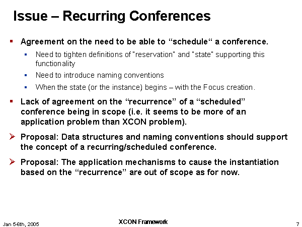 Issue – Recurring Conferences Agreement on the need to be able to “schedule“ a conference. Need to tighten definitions of “reservation” and “state” supporting this functionality Need to introduce naming conventions When the state (or the instance) begins – with the Focus creation. Lack of agreement on the “recurrence” of a “scheduled” conference being in scope (i.e. it seems to be more of an application problem than XCON problem). Proposal: Data structures and naming conventions should support the concept of a recurring/scheduled conference. Proposal: The application mechanisms to cause the instantiation based on the “recurrence” are out of scope as for now. |
