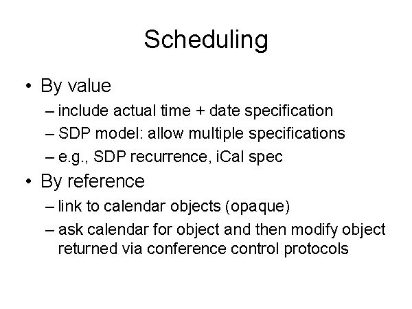 Scheduling By value include actual time + date specification SDP model: allow multiple specifications e.g., SDP recurrence, iCal spec By reference link to calendar objects (opaque) ask calendar for object and then modify object returned via conference control protocols |