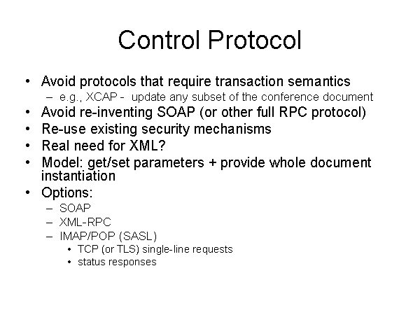 Control Protocol Avoid protocols that require transaction semantics e.g., XCAP - update any subset of the conference document Avoid re-inventing SOAP (or other full RPC protocol) Re-use existing security mechanisms Real need for XML? Model: get/set parameters + provide whole document instantiation Options: SOAP XML-RPC IMAP/POP (SASL) TCP (or TLS) single-line requests status responses |
