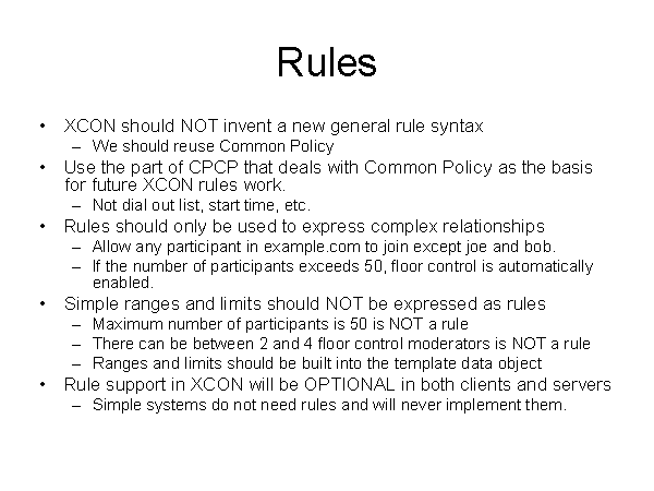 Rules XCON should NOT invent a new general rule syntax We should reuse Common Policy Use the part of CPCP that deals with Common Policy as the basis for future XCON rules work. Not dial out list, start time, etc. Rules should only be used to express complex relationships Allow any participant in example.com to join except joe and bob. If the number of participants exceeds 50, floor control is automatically enabled. Simple ranges and limits should NOT be expressed as rules Maximum number of participants is 50 is NOT a rule There can be between 2 and 4 floor control moderators is NOT a rule Ranges and limits should be built into the template data object Rule support in XCON will be OPTIONAL in both clients and servers Simple systems do not need rules and will never implement them. |