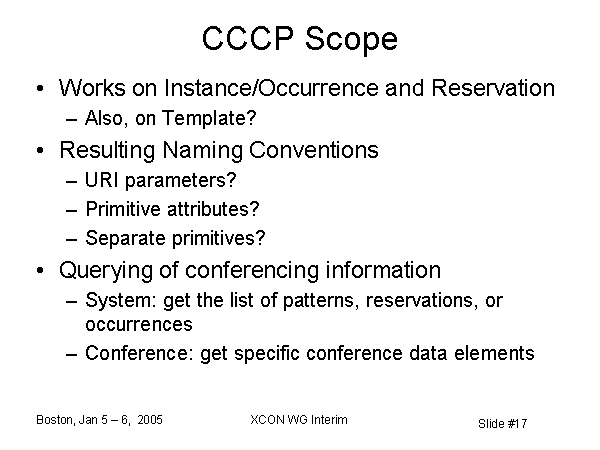 CCCP Scope Works on Instance/Occurrence and Reservation Also, on Template? Resulting Naming Conventions URI parameters? Primitive attributes? Separate primitives? Querying of conferencing information System: get the list of patterns, reservations, or occurrences Conference: get specific conference data elements |