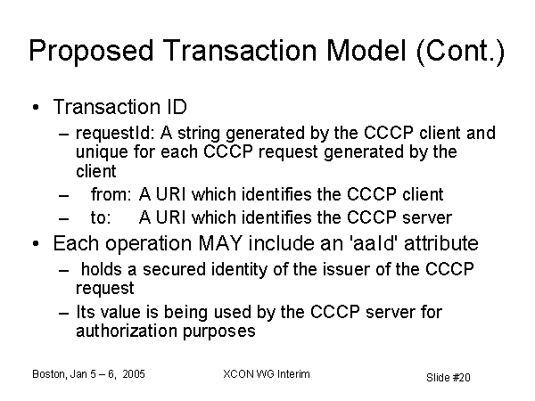 Proposed Transaction Model (Cont.) Transaction ID requestId: A string generated by the CCCP client and unique for each CCCP request generated by the client from: A URI which identifies the CCCP client to: A URI which identifies the CCCP server Each operation MAY include an 'aaId' attribute holds a secured identity of the issuer of the CCCP request Its value is being used by the CCCP server for authorization purposes |